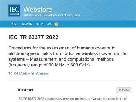 2022年11月4日,國際電工委員會(IEC)發(fā)布IEC TR 63377:2022《人體暴露于輻射式無線電能傳輸系統(tǒng)產生的電磁場的評估程序-測量和計算方法(頻率范圍從30MHz至300GHz)》。